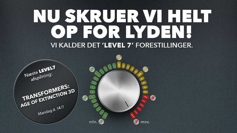 Tag dine sanser med på en ren rutsjebanetur, når vi inviterer til en visning af 'Transformers: Age of Extinction' i det, vi kalder Level 7! Til en Level 7-visning kan du forvente, at vi giver den en ekstra tand med lyden, så hver eksplosion, pistolskud og kvik replik kan mærkes helt ind i kroppen! Det er højt, det er sejt, det er lige på og hårdt - det er Level 7. Til vores næste Level 7-visning kan du opleve det nyeste kapitel i Transformers-sagaen, 'Transformers: Age of Extinction' i 3D!