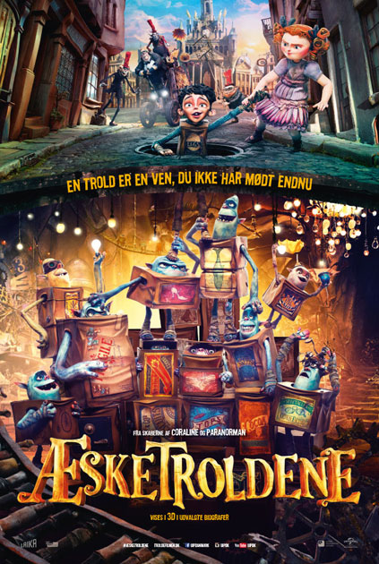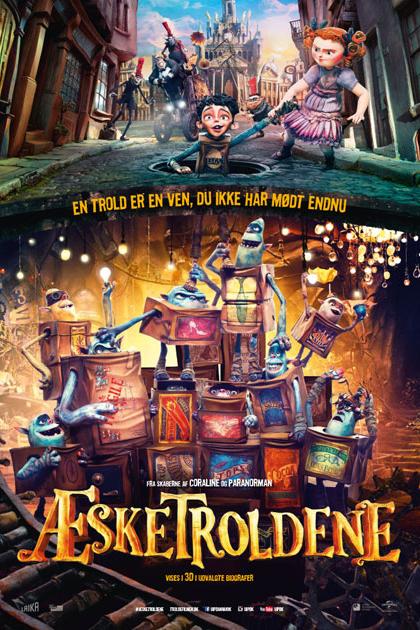 I den ildelugtende by Cheese Bridge låser borgere sig hver aften inde i frygt for de papkasseklædte monstre kaldet æsketrolde. De bor i byens kloakker, men kommer om natten op på gadeplan for at samle affald. Hvad ingen ved, er, at de skræmmende bæster i virkeligheden er uden skyggen af ondskab. Æsketroldene er kærlige væsener, der har taget en forældreløs dreng til sig og opdraget ham som en af deres egne under jorden. Da byen får besøg af en hæmningsløs skadedyrsbekæmper, der ønsker at udrydde troldene én gang for alle, må den unge dreng vende tilbage til sine medmennesker og forsøge at redde sin upopulære familie. ’Æsketroldene’ er baseret på børnebogen ’Here Be Monsters!’ af Alan Snow og instrueret af makkerparret Anthony Stacchi og Graham Annable. Sidstnævnte var del af det tekniske hold bag ’Coraline’ (2009) og ’ParaNorman’ (2012), og i sin instruktørdebut viderefører han den samme skæve blanding af familiefilmens lette tone med fremmedartede væsener. Familiefilmen er lavet med stop-motion-animation, der er en filmteknik, hvor en animator tager et billede af en figur, rykker figuren en smule, hvorefter der igen tages et billede. Dette gøres så mange gange, at figuren ser ud til at bevæge sig i den færdige film. (copyright: kino.dk)