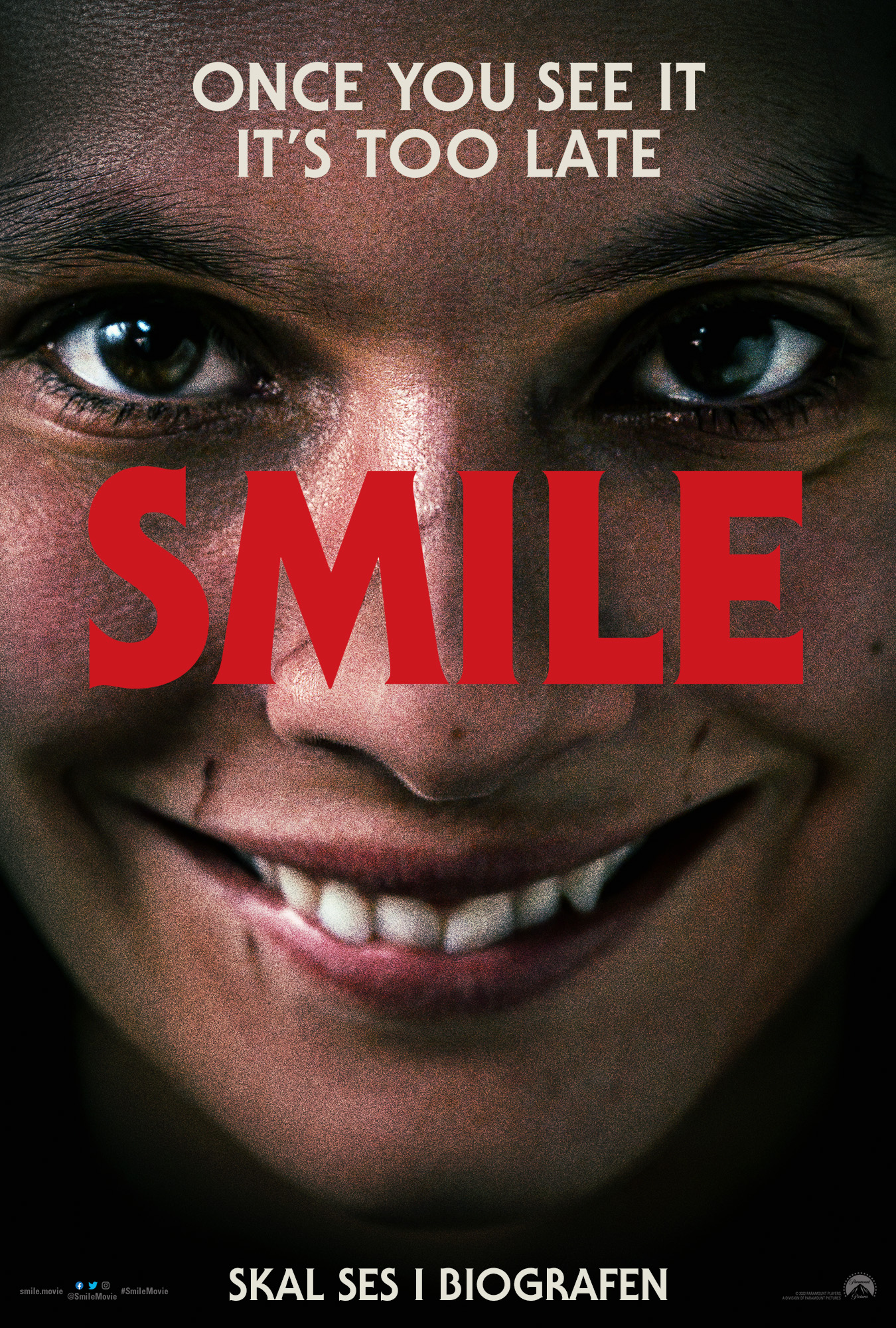 Gyserfilmen 'Smile' følger lægen Rose Cotter, som efter en mærkelig og traumatiserende episode med en patient begynder at opleve skræmmende hændelser. Det er da kun begyndelsen på det mareridt, som langsomt overtager hendes liv, og for at undslippe rædslerne tvinges Rose til at konfrontere sin smertefulde fortid.